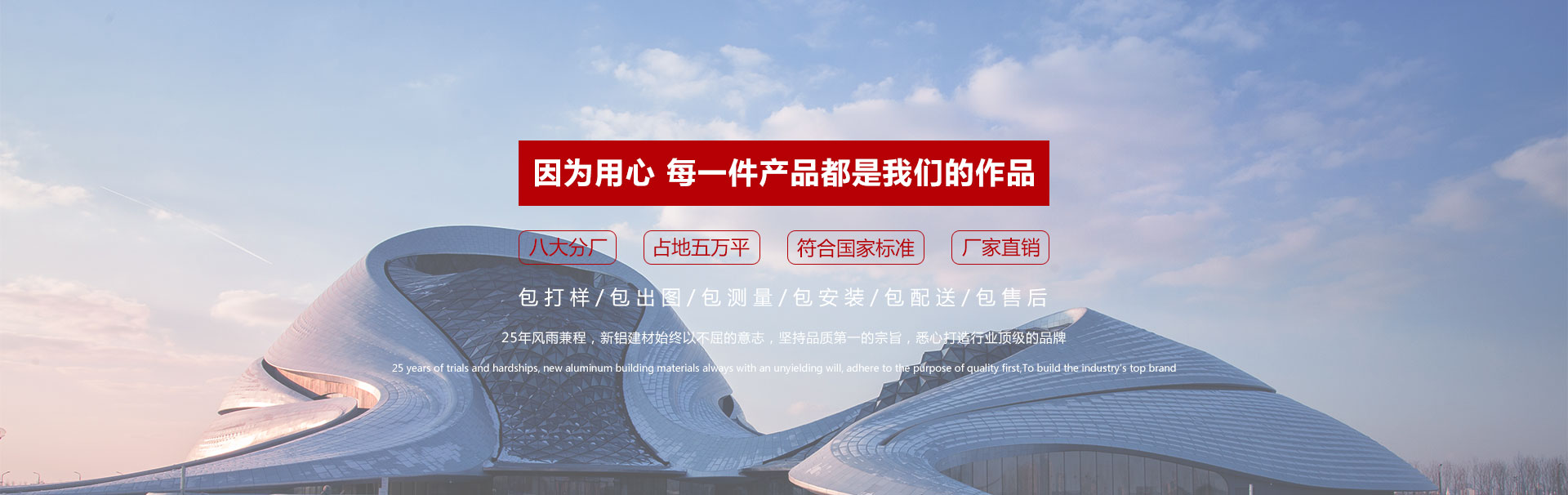 廣東新鋁裝飾材料有限公司是一家專業(yè)生產(chǎn)室內(nèi)外金屬鋁單板、鋁天花板、鋁蜂窩板、鋁窗花、弧形鋁方通、仿大理石板、仿木紋板、瓦楞板及鋁型材加工噴涂的現(xiàn)代化企業(yè),有著10多年研發(fā)、生產(chǎn)、銷售、安裝一條龍服務(wù)的集團(tuán)公司。公司擁有先進(jìn)的數(shù)控鈑金加工設(shè)備,配備了日本蘭氏全自動(dòng)靜電氟碳涂線、數(shù)控沖床、數(shù)控剪板機(jī)、數(shù)控折彎機(jī)及全自動(dòng)真空吸塑熱轉(zhuǎn)印機(jī)、數(shù)控?zé)釅簷C(jī)等多套先進(jìn)的高精度的幕墻產(chǎn)品生產(chǎn)加工設(shè)備。廣東新鋁裝飾材料有限公司秉承“以人為本、科技為先”的經(jīng)驗(yàn)理念,堅(jiān)持規(guī)模化運(yùn)作,規(guī)范化經(jīng)營的發(fā)展思路,建立了完善的營銷網(wǎng)絡(luò)及高素質(zhì)的銷售隊(duì)伍,擁有一支豐富經(jīng)驗(yàn)的設(shè)計(jì)團(tuán)隊(duì),專門配合建筑裝飾材料的深化設(shè)計(jì)及工藝構(gòu)思,品牌精益求精理念,高品位的產(chǎn)品、良好的質(zhì)量、精湛的工藝,豐富齊全的產(chǎn)品、安全可靠的質(zhì)量和專業(yè)完善的服務(wù)系統(tǒng)享譽(yù)于行業(yè)!
